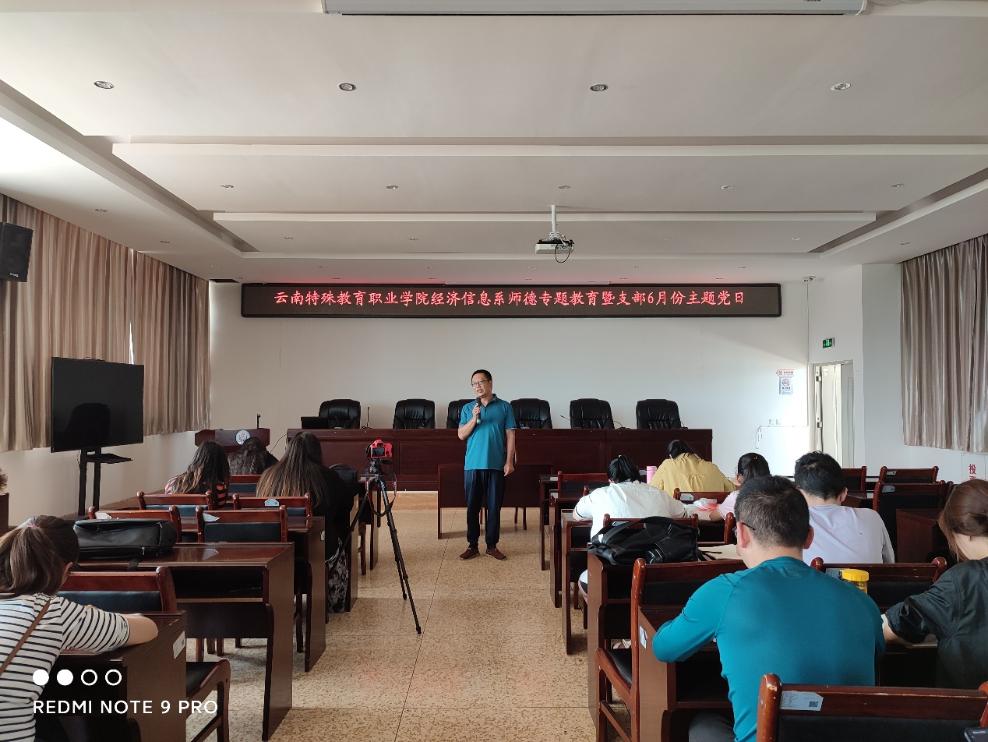 为全面贯彻党的指导方针,强化以党史学习教育为重点的“四史”学习教育,响应学院对教职工爱岗敬业、无私奉献的号召,提高我系教师政治素质和道德水平,调动我系教师教书育人的积极性,提高教学质量。根据《教育部关于在教育系统开展师德专题教育的通知》(教师函【2021】3 号)、《9227新葡的京集团师德专题教育工作实施方案》和《经济信息系师德专题教育工作实施方案》,经济信息系6月16日12:40在学院大会议室召开了师德专题教育暨支部6月份主题党日活动,全系教师参加了此次活动。