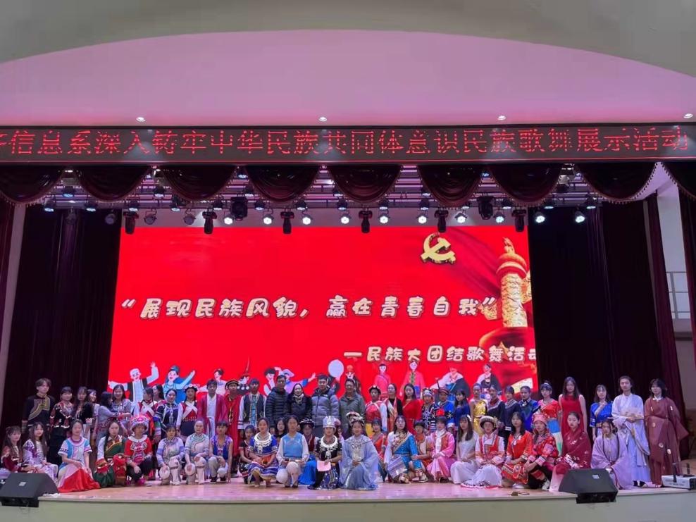 之后相继演绎独唱,维吾尔族、傣族、藏族等少数民族歌舞等节目,以及每个朝代的特色汉服走秀,身着不同民族服饰的同学们聚在一起起舞,象征着各民族团结一致,同心同德。活动最后在《爱我中华》的歌声中落下帷幕,唱出了中华儿女强烈的民族自豪感和荣誉感,把整场活动推向了高潮,点燃了现场师生的爱国豪情和报国之志。节目民族特色鲜明、表现形式多样、时代气息浓厚,精彩纷呈,丰富多姿的文艺汇演博得了在场观众阵阵掌声和喝彩,把中华民族一家亲的情感深深传递到了师生的心中。