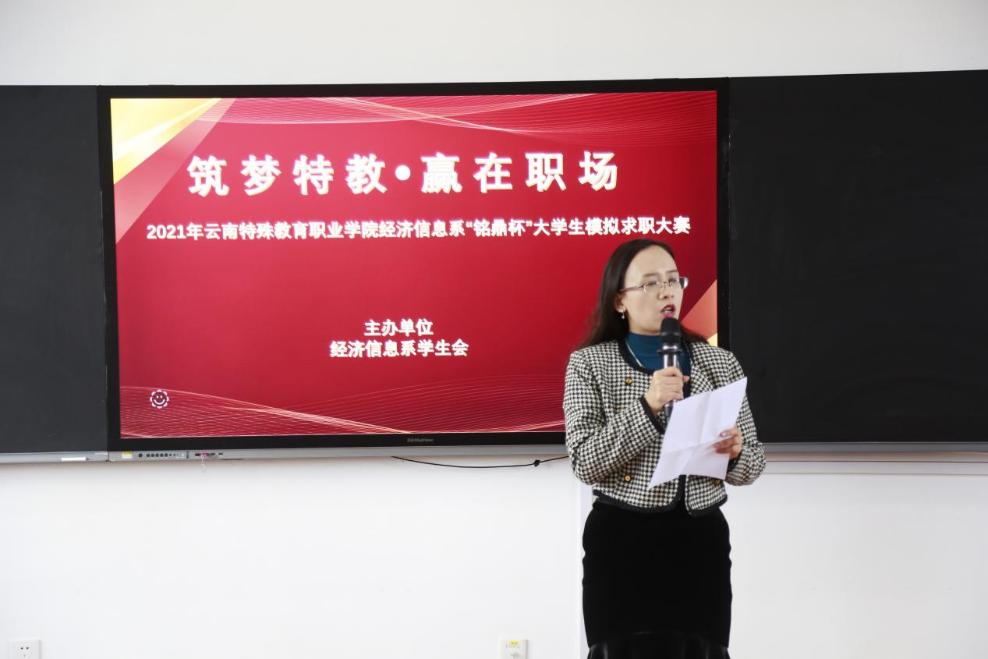 为贯彻党中央、国务院和省委、省政府关于做好“六稳”落实”六保”任务的决策部署,按照云南省教育厅、云南省人力资源和社会保障厅文件要求,积极响应学院号召,为了做好我系学生的就业指导工作,加大就业服务工作力度。2021年11月2日,经济信息系在玉璋楼408举行了“筑梦特教、赢在职场”2021年“铭鼎杯”大学生模拟求职大赛初赛。大赛邀请了沃尔玛昆明大区人事经理杨丽,昆明易桥职业培训学校校长李林,宁美有限公司昆明分公司总经理赵燕,小善科技人事主管丁凤、人事专员罗江超,经济信息系党支部副书记王小川担任此次大赛的评委。经济信息系党支部书记兼系主任高翠,经济信息系团总支书记郜锐,特教系团总支书记史洋及我系2020级、2021级学生代表到现场观赛。