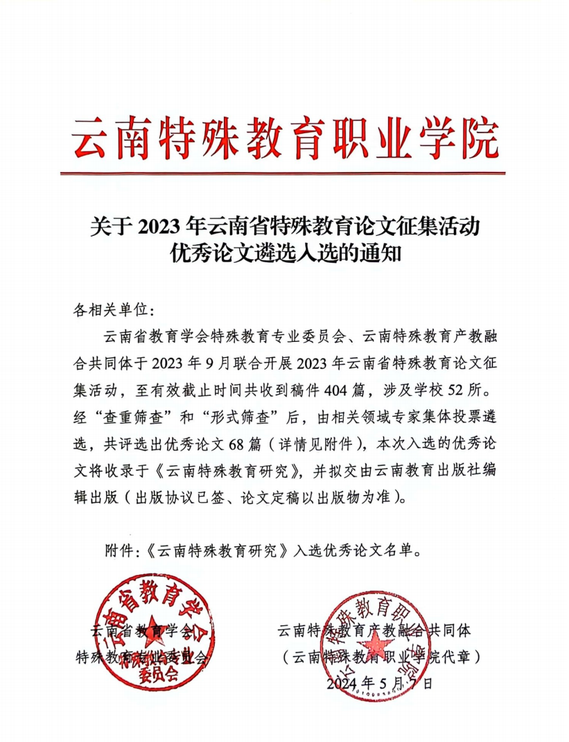 关于2023年云南省特殊教育论文征集活动优秀论文遴选入选的通知