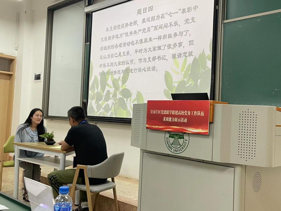 党务工作队伍素质能力展示活动上,来自云南省党建联学联建呈贡片区高校的12所高校推荐的“双带头人”教师党支部书记组、学生党支部书记组和专职组织员组一共35名党务工作者参加了本次评比和展示活动。开幕式上云南大学党委副书记陈华仙为本次活动致开幕词,她代表主办方对参加本次活动的评委和参赛选手表示热烈的欢迎,并预祝各组参赛选手取得优异成绩。本次活动内容精彩纷呈,充分展现了各高校党务工作队伍的风采。