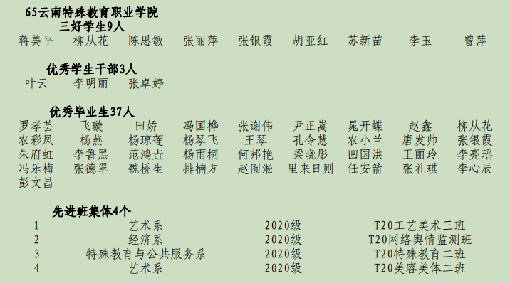 根据《中共云南省委教育工委、云南省教育厅关于公布2021-2022学年高校省级三好学生、优秀学生干部、先进班集体及大中专优秀毕业生名单的通知》。新葡的京9名学生荣获省级三好学生、3名学生荣获省级优秀学生干部、37名学生荣获省级优秀毕业生;4个班级荣获先进班集体。