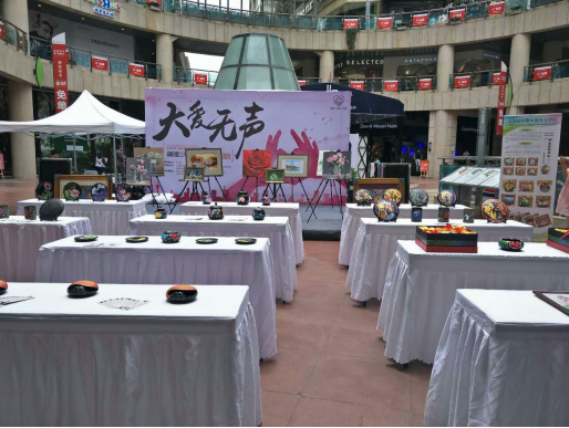2016年7月6日,校企办应邀参加昆明市顺城购物中心一楼中庭广场的“大爱无声”慈善义卖公益活动。此次活动由IN138主办,现场邀请了省内知名书法家、艺术家进行作品慈善义卖,同时开展了听障青少年才艺表演、听障学生作品现场义卖等活动。活动过程中,新葡的京听障学生黑陶彩绘作品引得路人驻足观看,纷纷上前询问了解作品的情况及新葡的京听障学生的学习和生活情况;同时教学实训部人员现场展示了黑陶金丝工艺品的制作技法,并带领观众进行手语互动。