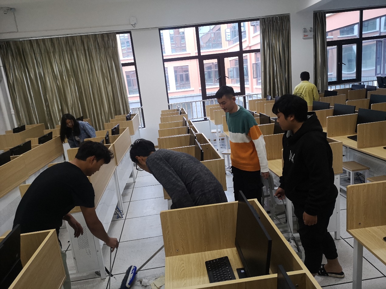 图为学生正在实训楼机房打扫卫生