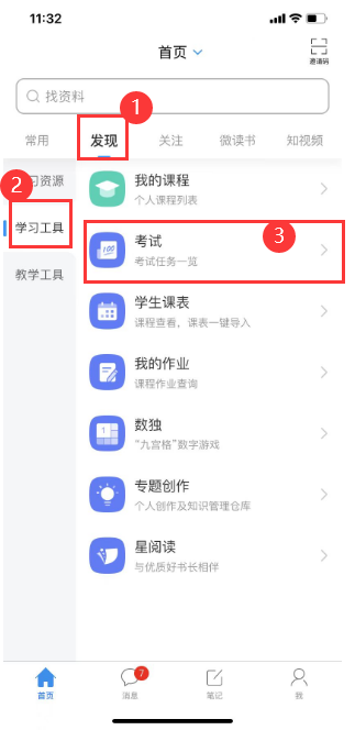 进入考试方式二:学校发起了考试后,点击首页————发现————学习工具————考试,点击进入考试即可。进入考试后人脸识别等操作的注意事项同方式一。
