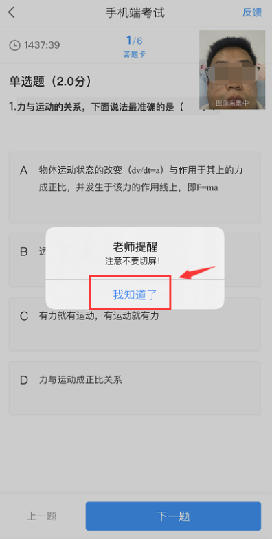 (九)考试在接收到监控老师提醒后,需点击“我知道了”,方可继续答题。