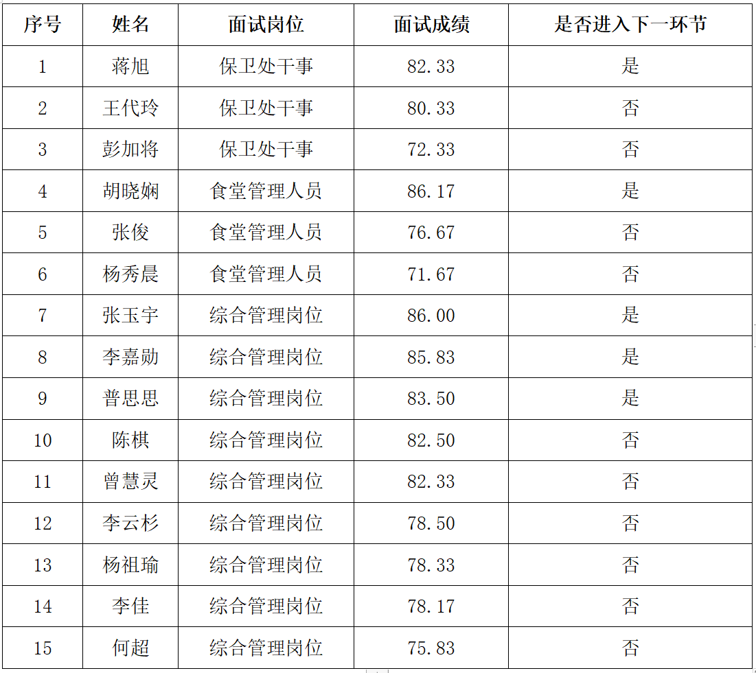 根据《9227新葡的京集团2024年招聘编制外工作人员公告》有关规定,本次招聘编制外工作人员的面试环节已经结束,现将面试成绩公示如下: