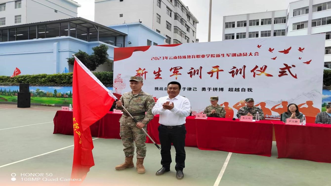 军训动员大会在学校党委副书记石安银向军训总教官授军训团团旗中结束。