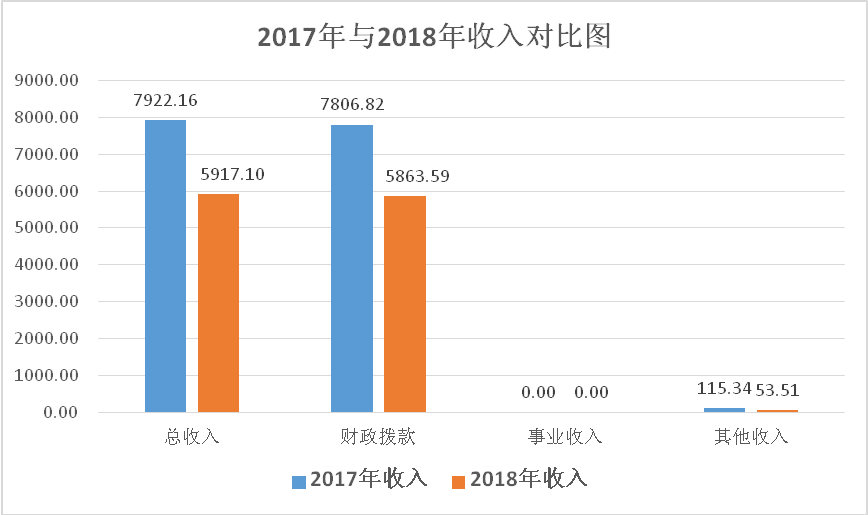 学校2018年度收入合计5917.10万元。其中:财政拨款收入5863.59万元,占总收入的99%;上级补助收入0万元,占总收入的0%;事业收入0万元,占总收入的0%;经营收入0万元,占总收入的0%;附属单位缴款收入0万元,占总收入的0%;其他收入53.51万元,占总收入的1%。与2017年度收入合计7922.16万元对比有所减少,主要原因是基建项目接近完工,基建收入比去年减少。