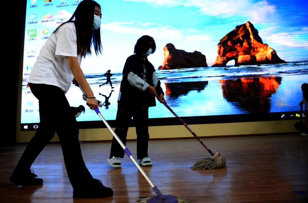 图为同学们对礼堂进行大扫除