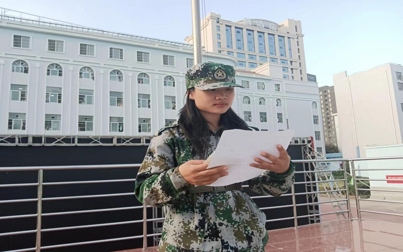 2023级新生王体艳代表受训学生承诺:必定严守纪律,严格训练,高标准、高质量完成军训任务,使思想和意志得到进一步提升。