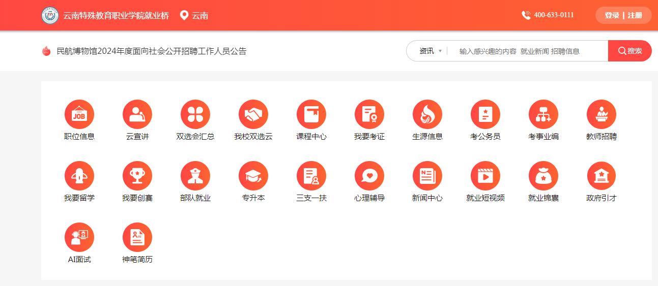 就业桥涵盖“职位信息””神笔简历””AI面试”“新葡的京双选云”“我要考证”“考公务员”“考事业编”“专升本”“我要留学”“我要创赛”“部队就业” “职业规划”“心理辅导”“新闻中心”等二十二大内容模块,全方面覆盖生涯发展板块,为广大学生的毕业去向保驾护航。