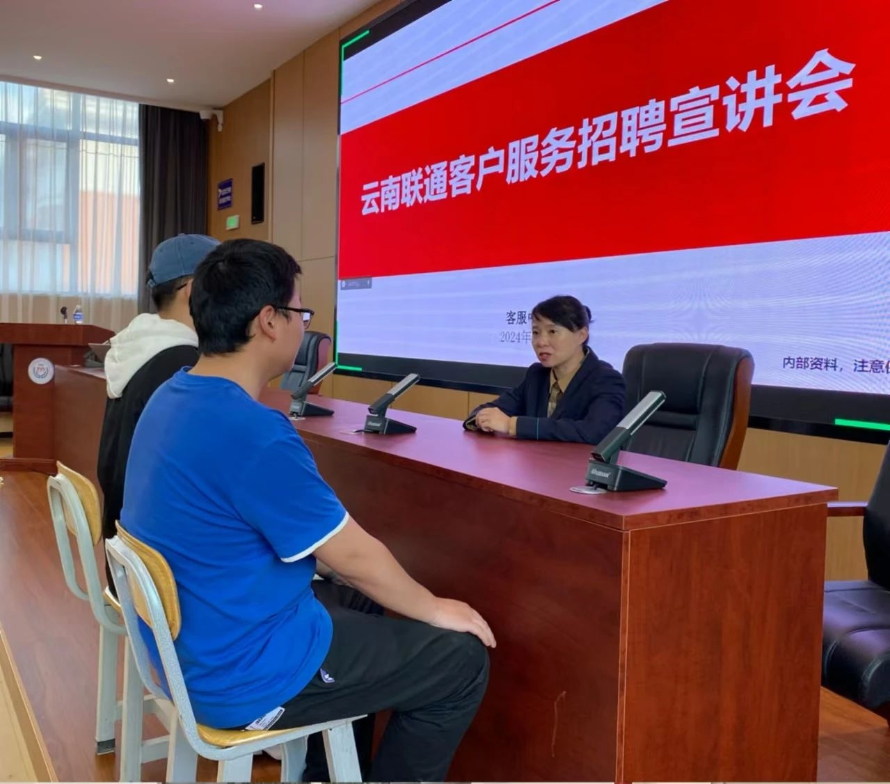10月24日,中国联合网络通信有限公司云南省分公司(简称“云南联通”)在新葡的京举办了一场专门的客服招聘宣讲会。此次宣讲不仅是企业宣传自身吸引人才的重要手段,更是促进新葡的京学生了解企业、明确职业方向的有效途径,双方可以实现更加高效、精准的匹配。