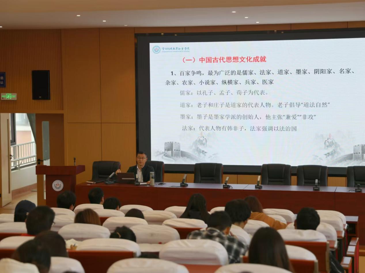 为积极响应党的二十大号召,深入贯彻习近平总书记弘扬中华优秀传统文化的重要指示精神,引导师生深刻领悟中国优秀传统文化的价值,培养爱国情怀、增强对中华文化的认同感和荣誉感, 11 月 20 日,新葡的京在玉璋楼 408 开展了“诵弦文化讲坛(第八期)————中国传统文化价值的现代应用”专题讲座。此次讲座由李永芳副校长主讲,宣传部部长张培新主持,各系学生代表参加。