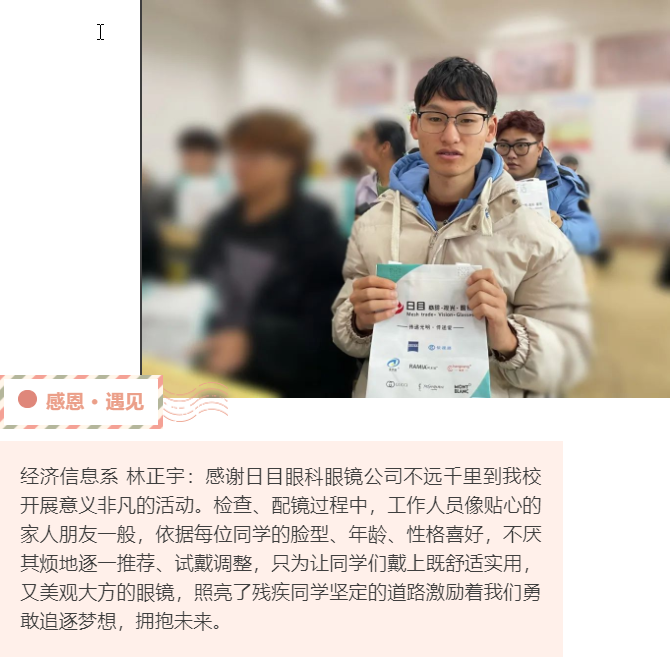 学校和爱心企业希望通过此次活动,不仅为学校残疾学生提供关注视力健康的机会,也让更多的学生认识到保护视力的重要性。学校相信,在社会各界的共同努力下,将有更多富有意义的公益活动得以顺利展开,为更多需要帮助的人提供支持。让我们共同携手,传递爱心,共创美好未来!