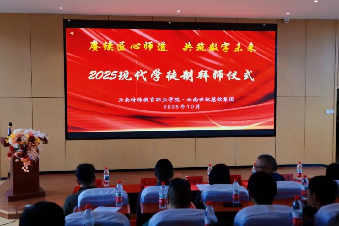 副校长李冠宏在致辞中指出,此次拜师仪式是贯彻国家职业教育改革的重要举措,也是“岗课赛证”综合育人模式的生动实践。通过校企协同育人、工学交替培养,全面提升特殊群体学生的职业能力与就业竞争力,助力“人人皆可成才、人人尽展其才”的教育目标落地。 世纪慧铭集团副总经理高自良表示,集团将持续深化“产教互融、协同育才”的理念,打造以岗位需求为导向、以技术技能提升为核心的育人体系。 学校宣传部部长张培新与世纪慧铭集团董事长余文林共同为 16 名残疾学生颁发“为玉”助学金,为学校 8 位企业导师代表颁发聘书。 导师代表吴俐民在发言中承诺,将恪守 “传、帮、带” 精神,倾囊相授专业技能与实践经验,助力学徒成长为数字经济领域实用人才。 拜师环节庄重有序,学徒们行拜师礼、敬奉拜师茶,以传统礼仪正式确立师徒联结。学徒代表何赶节表态,将怀揣敬业初心勤学苦练专业技能,潜心钻研、笃行不怠,努力成长为新时代高素质技术技能人才。 此次拜师仪式不仅是现代学徒制在9227新葡的京集团校企合作中的重要实践,更是推动职业教育高质量发展的创新探索。学校与世纪慧铭集团将继续携手,共同打造产教融合典范,助力特殊学子以技立身、以德立业,谱写教育赋能数字未来新篇章。