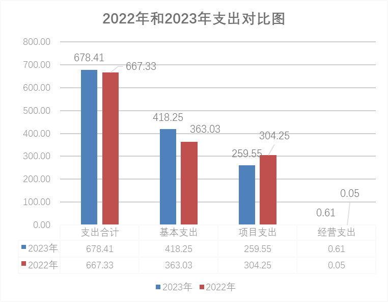 9227新葡的京集团2023年度支出合计6784.11万元。其中:基本支出4182.54万元,占总支出的61.65%;项目支出2595.51万元,占总支出的38.26%;上缴上级支出0.00万元,占总支出的0.00%;经营支出6.07万元,占总支出的0.09%;对附属单位补助支出0.00万元,占总支出的0.00%。与上年相比,支出合计增加110.84万元,增长1.66%。其中:基本支出增加552.29万元,增长15.21%;项目支出减少447.01万元,下降14.69%;上缴上级支出增加0.00万元,增长0.00%;经营支出增加5.57万元,增长1114.00%;对附属单位补助支出增加0.00万元,增长0.00%。主要原因是:一是由于医疗保险缴费改变,公务员医疗大幅增加,导致基本支出中的人员经费单位支出增加幅度大,基本支出增加幅度较大。二是项目支出中,残疾人事业的彩票公益金支出项目、中等职业教育项目、现代职业教育提升计划项目资金支出减少,导致项目支出同比减少。三是经营支出用于支付2023年经营相关税收费用增加,导致经营支出同比增加。