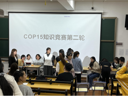 活动一开始,主持人带领全体参赛者喊出“喜迎COP15,我们一起为COP15打call”的口号,紧接着就宣布了比赛规则,每个队伍由两名同学组成,第一轮必答题,16个组,每组五题;第二轮为抢答题(在主持人说开始前不能抢答,否则扣五分)。参赛组派一名学生抽签决定答题顺序。