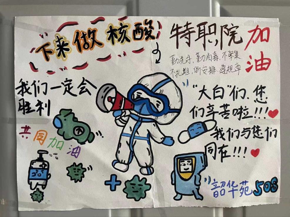 在学院静默管理期间,特殊教育与公共服务系在校师生积极响应学院号召,配合疫情防控相关工作。在校教师尽心尽力为同学们提供服务,同学们在宿舍也用自己的方式,表达着自己的感谢,描绘了心底的希望。