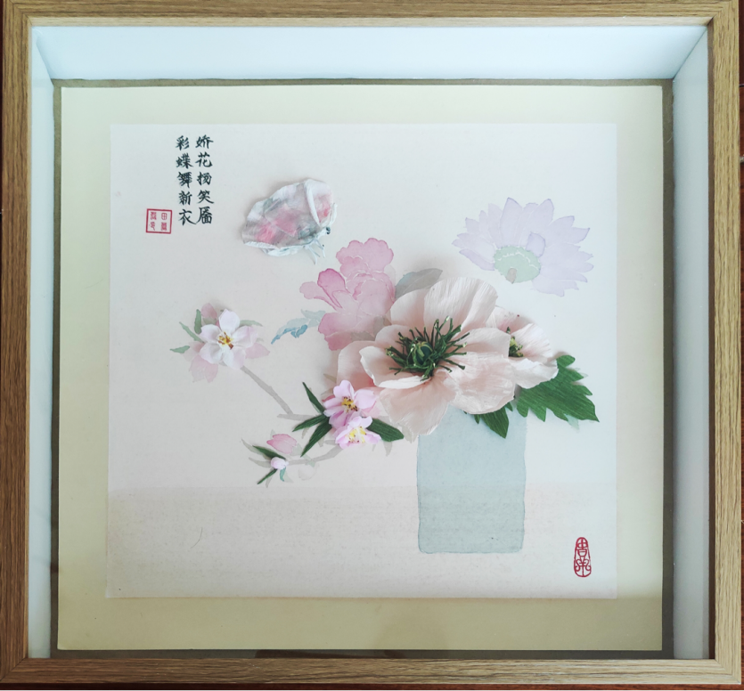 作品《牡丹争艳》综合了多种立体材料,色彩冲击力较强,展示出了该生对家具装饰画的较为深刻的理解。