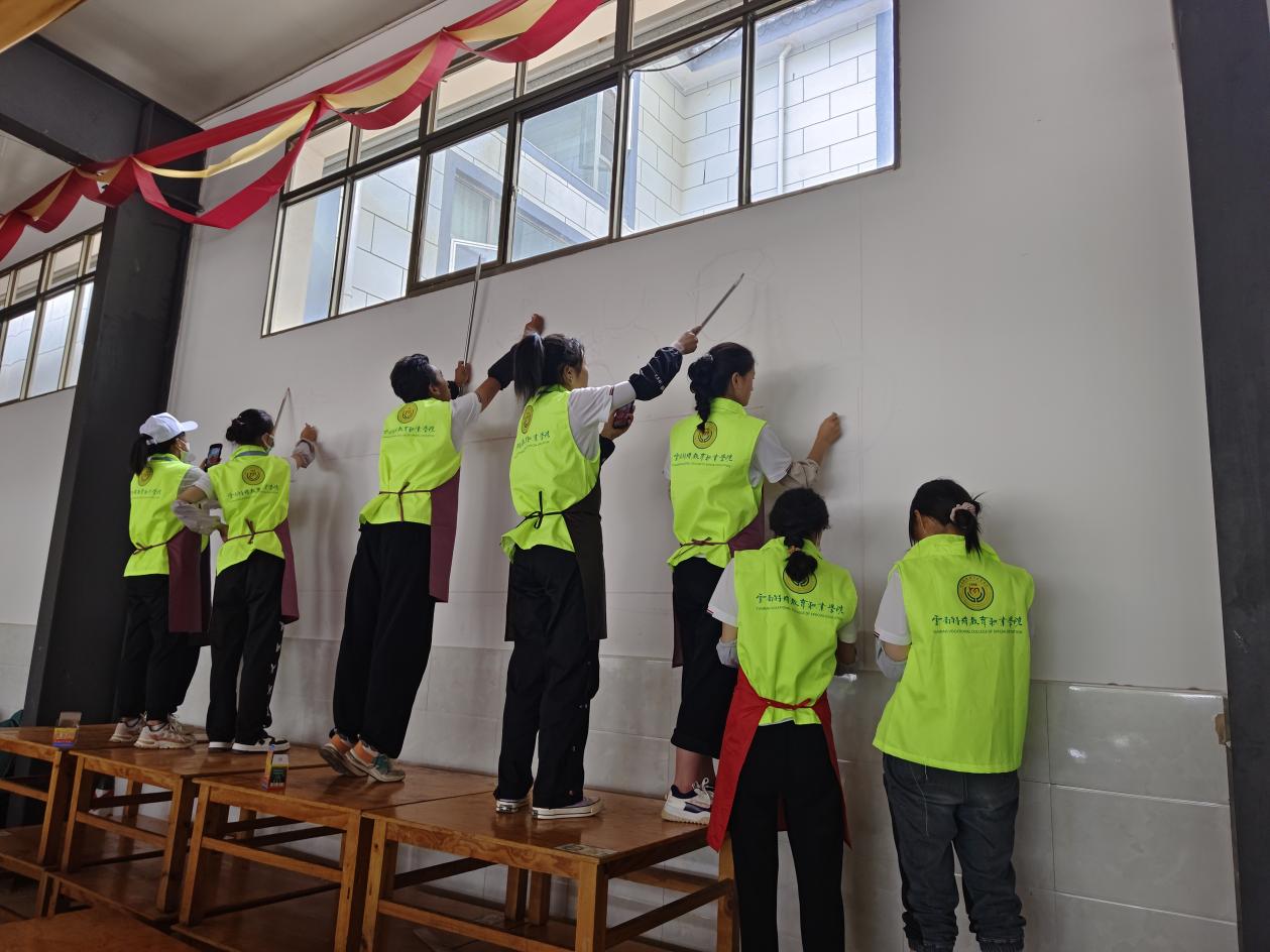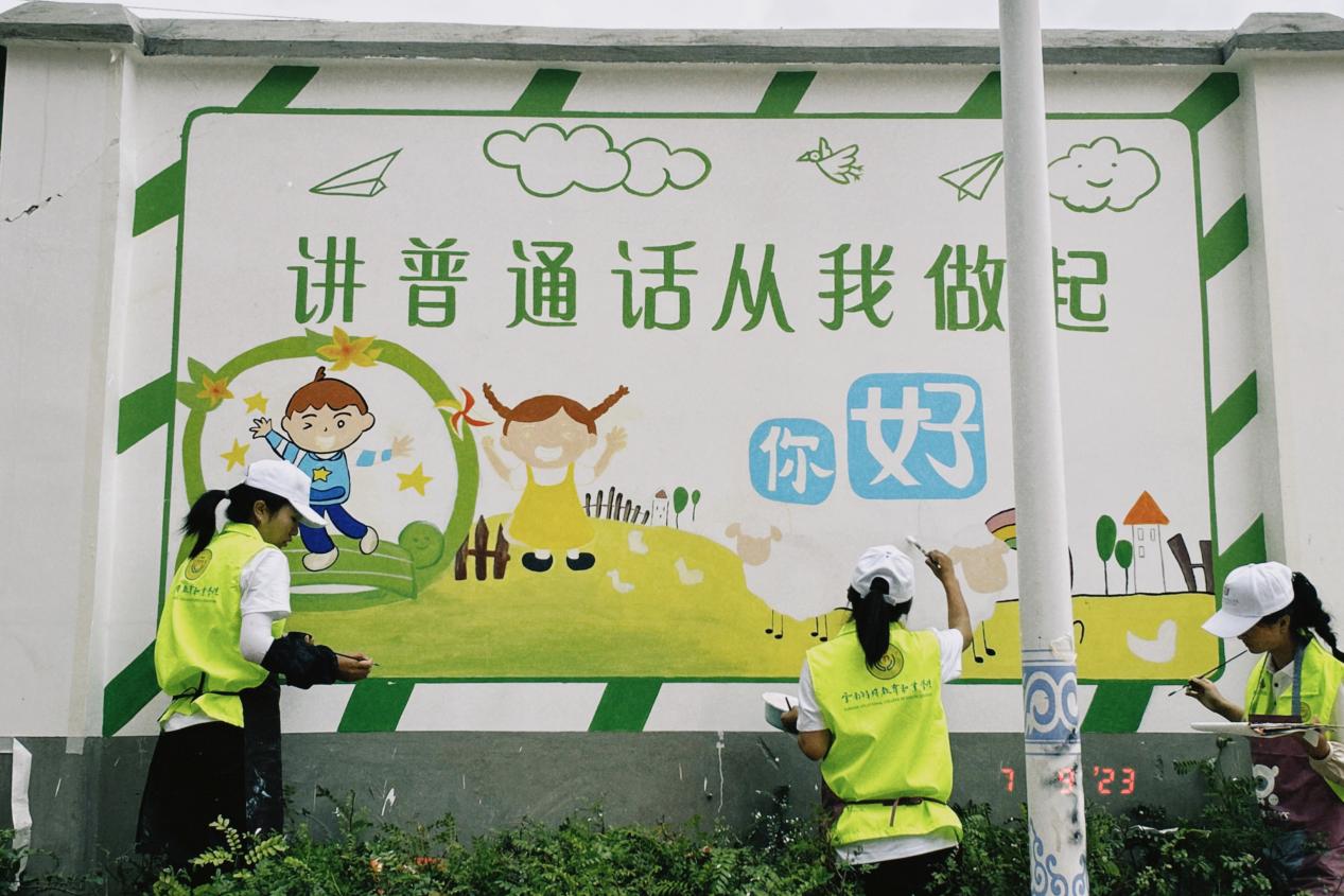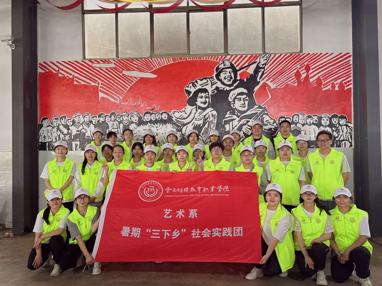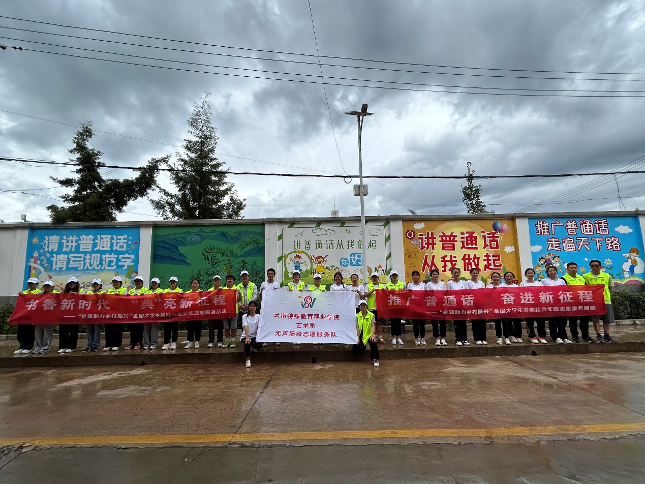 为加大国家通用语言文字推广力度,服务铸牢中华民族共同体意识,助力乡村振兴战略实施,切实发挥共青团作用,引导和帮助广大青年学生在与现实相结合的“大思政课”中受教育、长才干、作贡献。9227新葡的京集团艺术系组织29名学生(其中听障学生13名),组建成立无声墙绘志愿服务实践团,于2023年7月7日至9日前往玉溪市江川区三街社区开展“推普助力乡村振兴”暑期社会实践志愿服务活动。此次活动由艺术系团总支书记杨崇方带领,指导教师有徐润刚、蒙晗婷、吕南及马克思主义学院柳琴,活动得到了江川区团委和新时代文明实践中心的大力帮助和支持。