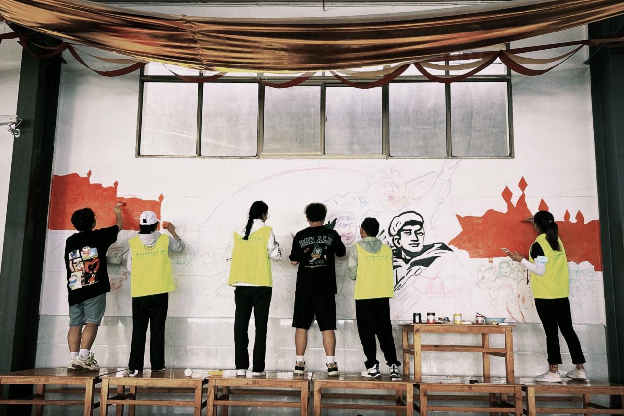 实践团成员共同为墙画上色